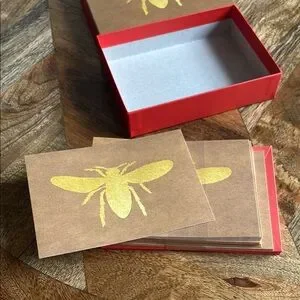 Elegant note card set with red envelopes and a gold bee design on blank cards. Includes 15 cards and envelopes. Perfect for any occasion. See photos for measurements.