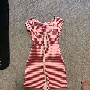 Chic red and white striped dress with cap sleeves. Perfect for casual outings. There is a tiny mark on it that’s hard to see even when you look for it. In the last photo.