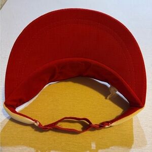 Fun and stylish visor. Features a vibrant red and white design. Perfect for sunny days. Adjustable strap