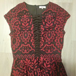 This lacey floral peplum shirt has a faux corset in the front, which has a black material directly behind it. Looks/feels unworn and practically brand new! Tag says size small but fits more like a medium.