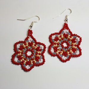 Red and silver crystal glass handcrafted earrings. Flower pattern. 2"