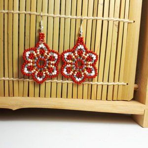 Red and silver flower pattern glass beaded earrings