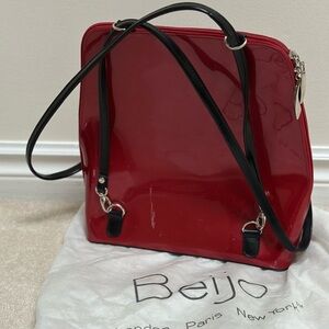 Beijo brand red gently used purse. Use as a backpack or shoulder bag. Glossy patent leather look with black leather straps and solid hardware. Black interior.