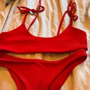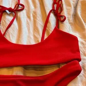 Red ribbed bikini top and bottom