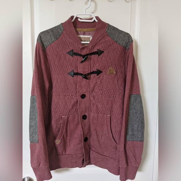 cross-hatch stitch pattern, elbow and shoulder decals. unique buttons and ties