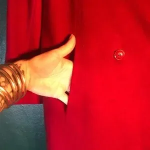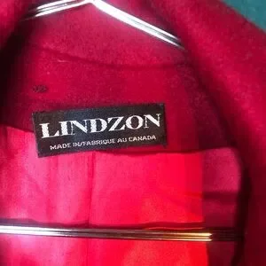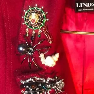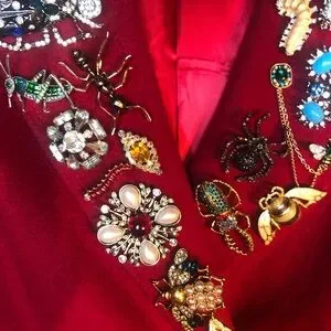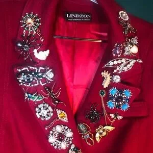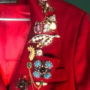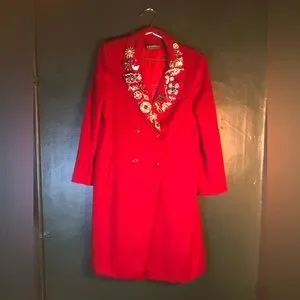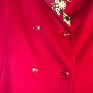Double breasted, lined in satin,100%wool coat adorned with 25 bug brooches, gorgeous rich red