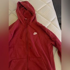Red nike jacket has a small whole on left side easily fixed with sewing machine