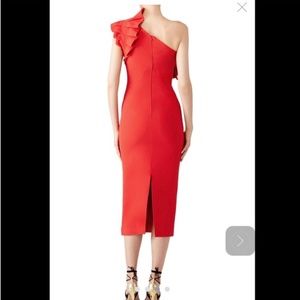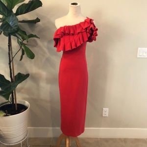 fitting for a Greek goddess yet tailored for the modern woman, this draped-crepe sheath dress will be the one of a kind dress that steals the spot light. 46” length Center zip closure. One-shoulder neck. Sleeveless. Lined. 100% crepe. Ruched front. preowned good condition