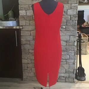 Bright red sheath dress. 90’s office wear. Back hidden zipper. Small slit at back. Midi length. Sleeveless. Made in Canada. Joie De Vivre brand. Approx. size 6.