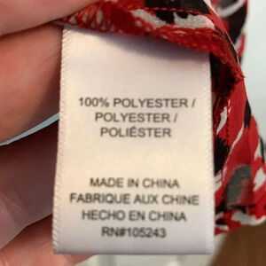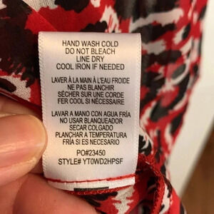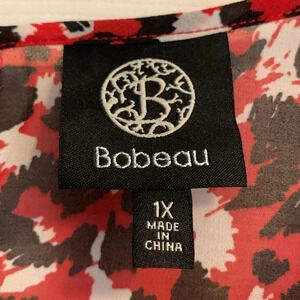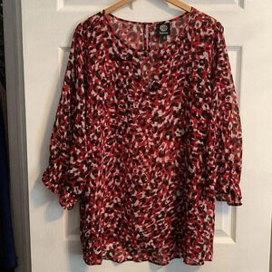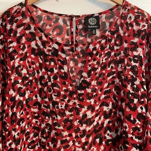 Red with black and white animal print! Light and flowy. Peek a boo V neck and hole in back W button. 3/4 sleeves with rouched sleeve cuffs. So pretty! Immaculate. Size 1X