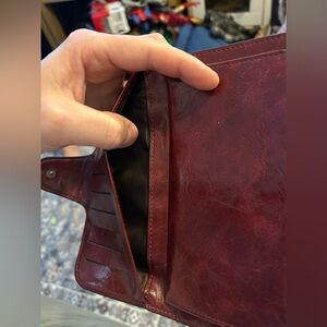 Burgundy wallet lots of compartments for cards and change. Coupons etc. excellent used condition. Similar products available on amazon.