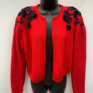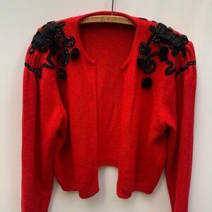 Red wool cardigan with vintage embroidery/Red and black vest with fur pompoms