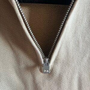 The Re/Done Tan Zip Up Sweater offers a relaxed fit with a minimalist design, perfect for versatile styling. Crafted from a soft fabric, this sweater features a zip-up closure and a collared neckline, making it an ideal choice for casual layering. Its neutral tan color adds an earthy tone to your wardrobe, ensuring it pairs effortlessly with various outfits.