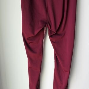 Trendy leggings featuring a burgundy base with pink and multicolor accents. Perfect for workouts or casual wear. Full-length, size small.