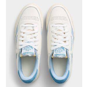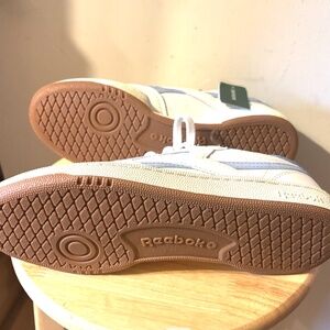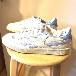 Reebok Classic Club C Revenge Vintage blue and white sneakers new in box. Genuine leather upper, perforations at the front for better ventilation, comfortable padded collar and tongue, padded footbed, embossed non-skid rubber outer sole. Colour is accurate in the stock photos, mine are taken in artificial light. Marked size US 8.5. This item comes from a smoke free, pets friendly home. Recycled bags/box used when possible. Please, let me know if you'd like any additional pictures and/or measurements or other info. Thanks for looking!