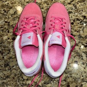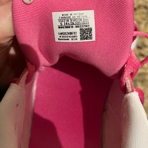 Reebok Classic shoe in cute pink colour! Size youth 5 which is about a womens 6.5-7. I wore them in the house once, other than that brand new! See photos for details and condition.