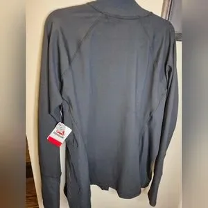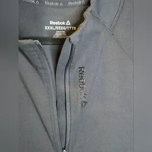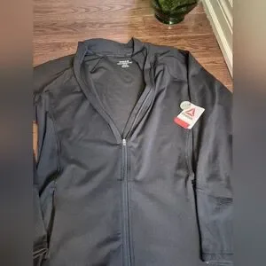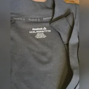 Reebok black full-zip jacket. Size is USXXXL but gives a close fit because it is stretchy and designed as a slim fit. This jacket is moisture management material. P-P 24". Ideal for everyday comfort.