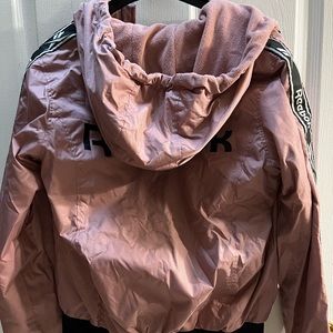 Fleecy inside but tracksuit material on the outside, this jacket is great for early winter. Very warm and cozy inside. Drawstring hood and black stripe that says “Reebok” down each arm.