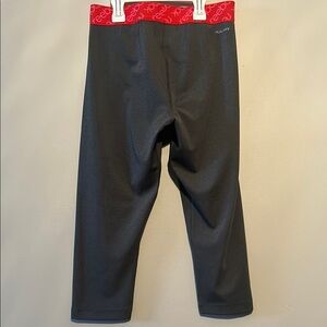 Experience ultimate comfort and style with these Reebok leggings, featuring a sleek gray design complemented by a vibrant red waistband. Crafted from a stretchy athletic material, they offer a fitted silhouette perfect for workouts or casual wear. The subtle branding on the lower leg adds a touch of sporty elegance.