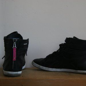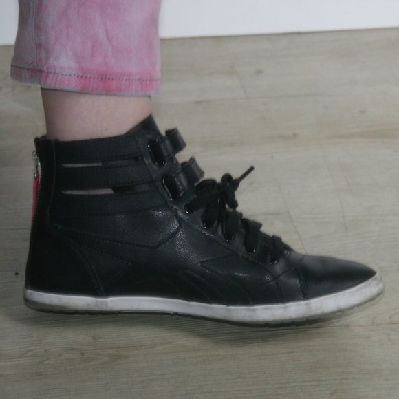 Black leather high-tops with a zipper closure on the back of the shoe, 2 velcro straps and laces in classic reebok style.