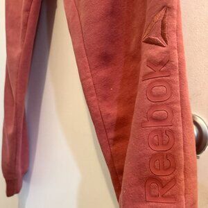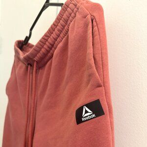 🏃♀️ Reebok high-waisted sweatpant joggers in a soft peach/terracotta tone with a cozy soft brushed-back fleece lining.