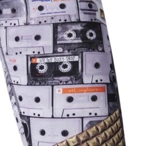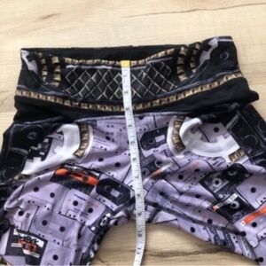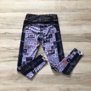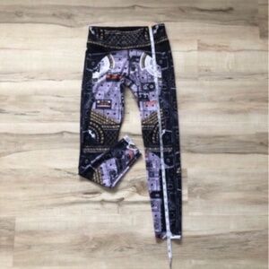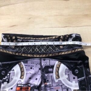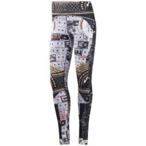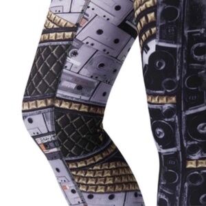 Bold leggings with a tech-inspired design. Features black, gray, and gold tones. Ideal for active ness.