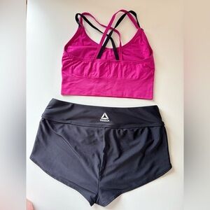 Get moving in style with this vibrant Reebok set! The hot pink sports bra features criss-cross back straps for extra support, while the black high-rise shorts offer a flattering athletic fit. Ideal for gym, yoga, dance or lounging.
