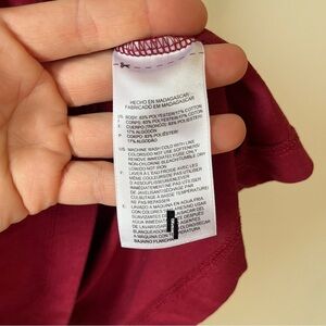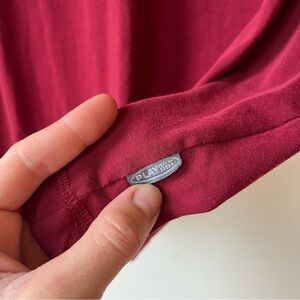 Reebok PlayDry athletic T-shirt in a deep maroon red. Features a subtle Reebok logo on the chest and a PlayDry logo tag near the hem. Made from a soft, lightweight 83% polyester and 17% cotton blend for breathability and comfort. Great for workouts, casual wear, or layering. Size Medium — measurements included in photos. Made in Madagascar.