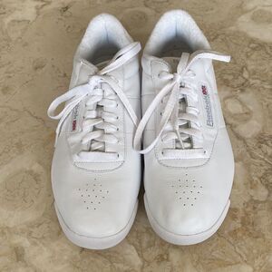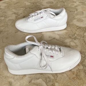 In as new condition Reebok Princess aerobics shoes, so totally old school! Between cushion and timeless style, let the Princess white synthetic leather lace up sneaker from Reebok cast its spell over you. You'll fall hard for the clean upper design with subtle perforations and stitching. Featuring a synthetic leather upper. Soft terry lining/moisture absorption and comfort. Padded foam sockliner/comfort and cushioning. These are right out of the 1980’s aerobics craze!