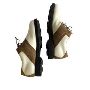Reebok vintage style suede and leather like lace up golf sport sneakers cleats shoes. Tan and white in colour. Size 5. Great pre-owned condition / GUC with flaw: marks on white toe - pictured. Approx measurements are pictured. Ships in 1-2 business days. Offers welcome!
