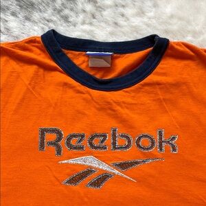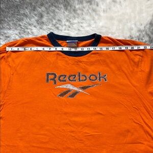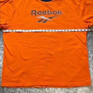 Vintage-inspired Reebok men’s graphic t-shirt in a bold orange color with navy collar and sleeve trim. Size XXL. Features embroidered Reebok logo on the chest and soft, comfortable fabric. Perfect for casual wear, sports fans, or collectors of retro athletic apparel. Good used condition with no noticeable flaws.