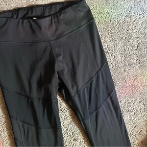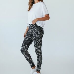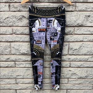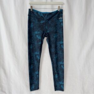 Vibrant blue leggings with black and white accents.
