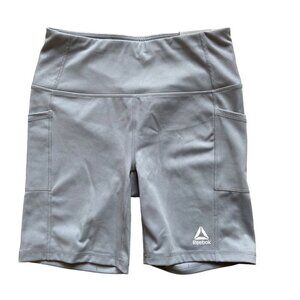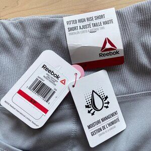 Keywords: Reebok shorts, women's activewear, high-rise shorts, fitted shorts, workout shorts, moisture-wicking, running shorts, gym shorts, athletic wear, side pocket shorts, gray shorts, polyester spandex, sports shorts, Reebok Women shorts Fitted High Rise Moisture Management Shorts S Gray stretchy Reebok Women shorts small Fitted High Rise Moisture Management pockets S Gray stretchy bodycon