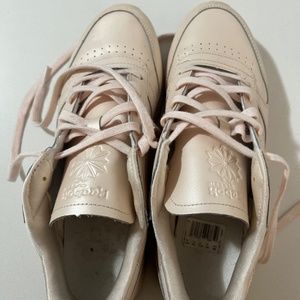 Tinted metallic baby pink Reebok sneaker. Barely used. The heel can very early be cleaned to look good as new, no marks on the shoe