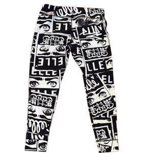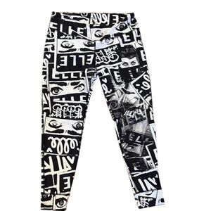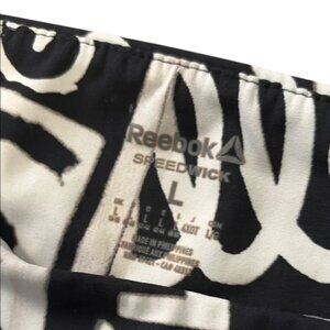 Reebok Lux Bolds Performance Tights are women's training leggings featuring a black and white graphic print created in collaboration with graffiti artist ELLE. They have a fitted design and are made with a wide, high-rise waistband that offers a secure, hugged-in feel and a flattering silhouette.