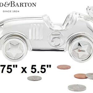 This Silver-plated race car coin bank features wheels and a key that turns. With fine details and a sleek shape, this bank is a clever gift for a little one learning to save. Part of the Race Car Collection. Measures 4"H x 6.75"L. Tarnish Resistant.