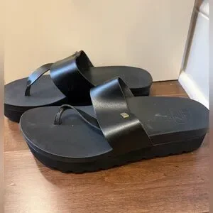 Platform slide sandals with toe-post design. Smooth black upper with small metal Reef badge. Cushioned molded footbed for comfort.