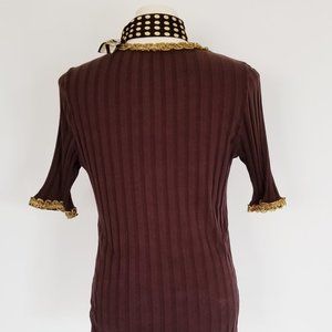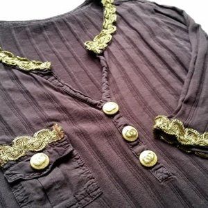 I embellished & refashioned this comfy chocolate coloured t-shirt with golden vintage lace + buttons & features a small chest pocket. Complete the look with the included vintage scarf!