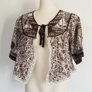I created this adorable shrug from upcycled cotton fabric, vintage lace & beads. The shrug features a cute ditsy floral/bird pattern, lightly puffed sleeves, ties at the neckline, bead details & lace trim.