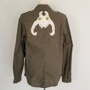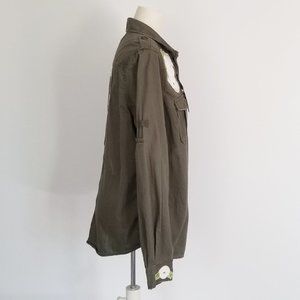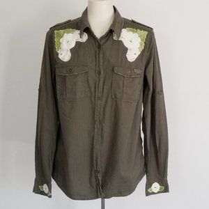 I refashioned this army green shirt from Berlin with vintage applique embroidery on the shoulders, back & cuffs. ♥ The shirt has 2 chest pockets & roll up sleeve tabs.