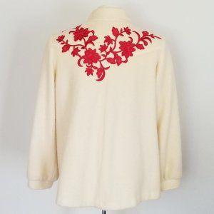 I mended, updated & refashioned this beautiful vintage coat. This wool coat is fully lined & features 2 side pockets, a button closure, nehru collar, lightly puffed sleeves & a lovely embroidered floral patch detail.