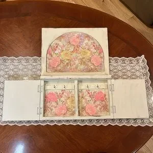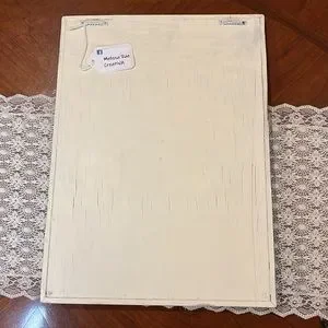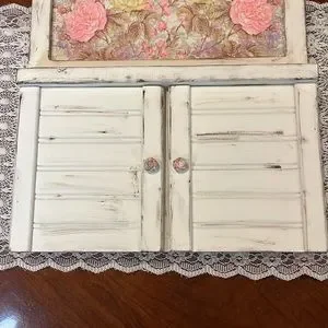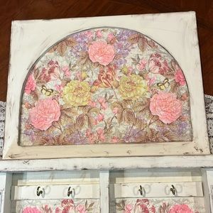 I refinished this adorable, vintage key rack. It has a cute cottage, shabby chic, feel to it. It’s in excellent condition and all the hardware works as it should. It was painted with chalk paint and sealed up well. I then used beautiful napkins and decoupage all of the flowered areas. The measurements are in the pictures.