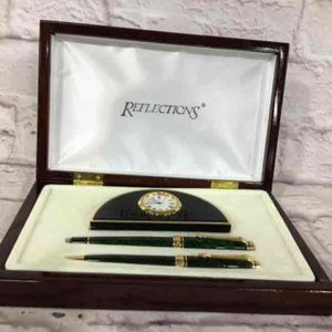 Reflections Black & Golden 2 Writing Pens and Desk Clock Set with Case.