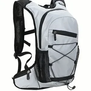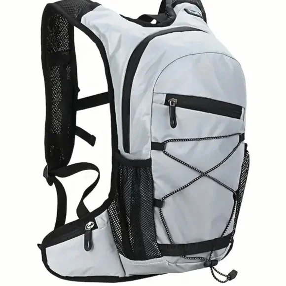 Brand new reflective backpack - a MUST for being seen at night. Wear it cycling, jogging, walking, motorcycling…anywhere you go when the sun goes down. Lots of storage, pocket for a water bottle, reflective cord, big zipper grips, and wraparound waist nylon webbing secures with a plastic clip buckle.
