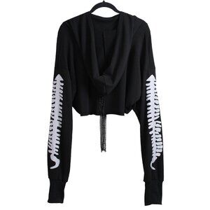 An alternative-style hoodie in black. It has reflective graphics of wings centered at the front and skeletal fishbone running down each sleeve. Made from lightweight fleece material, it has a comfortable stretch. Perfect for all seasons with appropriate layering. Like new, excellent condition.