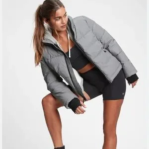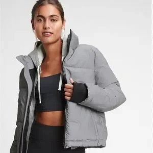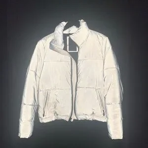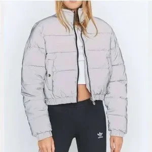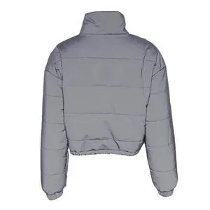 Warm, cropped silver puffer jacket. Reflective in the light making it highly visible in the dark.