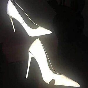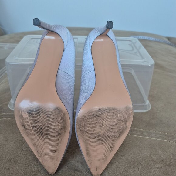 These reflective heels are stunning, just a tad too small for me. Have a faux snake skin print in a light lavander color. When certain light hits the shoe they reflect and glow a bright white /silver, absolutely beautiful and unique. Worn a few times, and in good worn condition. Some small marks as shown in photos.
