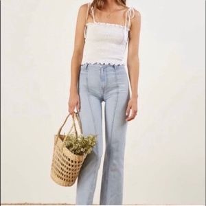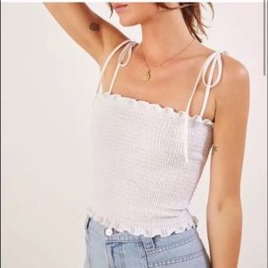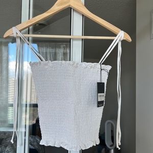 I'll go for one drink. This is a tight fitting top with a smocked bodice, strap ties and a ruffle edged neckline.