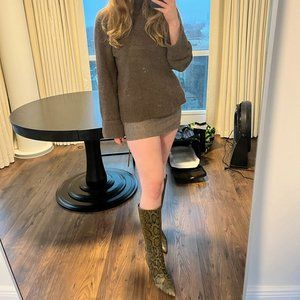 Reformation micro tweed fabric with a fabric belt. Zipper closure. Belt is adjustable. Reminiscent of Miu Miu current collection.