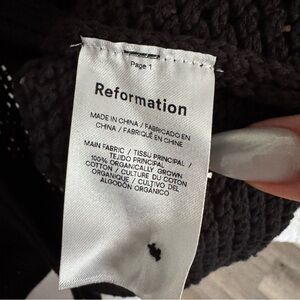This Reformation cardigan features a classic V-neck design in a solid black color, offering a versatile and timeless look. The knit texture provides a breathable yet structured feel, making it perfect for layering in any season. Its long sleeves and standard hip-length cut ensure a comfortable and flattering fit.